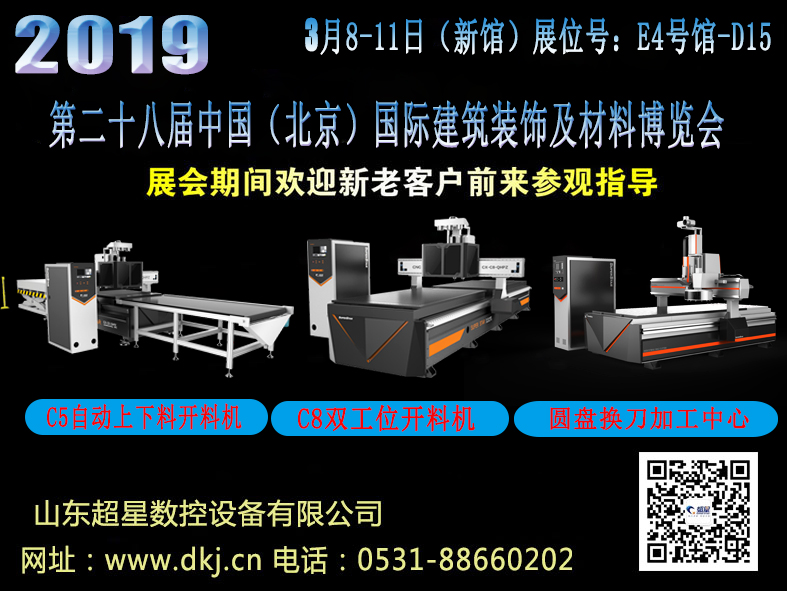 您好,超星數(shù)控將于2019年3.8-11日在中國國際展覽中心,舉辦的二十八屆中國(北京)國際建筑裝飾及材料博覽會(huì)。本次展會(huì)的主題是:數(shù)控標(biāo)準(zhǔn)型板式家具生產(chǎn)線。展會(huì)參展機(jī)器,超星新款黑色系,有木工加工中心、四工序開料機(jī)、絲杠換刀機(jī)、C5雙切排鉆開料機(jī)、雙工位排鉆加工中心、四工序開料機(jī)、實(shí)木側(cè)銑機(jī)、側(cè)孔機(jī)等。
