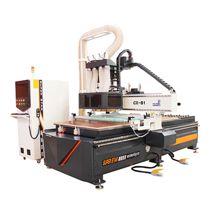 多工序木工雕刻機(jī)擁有多個機(jī)頭,如:三工序木工雕刻機(jī)就有三個機(jī)頭,三個機(jī)頭上安裝不同類型的刀具,當(dāng)需要換刀時,當(dāng)前的機(jī)頭上去,需要的機(jī)頭下來繼續(xù)雕刻。木工加工中心是僅有一個機(jī)頭,但是他擁有一個刀庫,不同機(jī)型有不同的刀庫容量,有8把、12把等,根據(jù)刀庫的形狀和換刀方式有盤式換刀、斗笠式換刀、排式換刀等,換刀時,機(jī)頭移動至刀庫,選擇好需要的刀具,回來繼續(xù)雕刻。